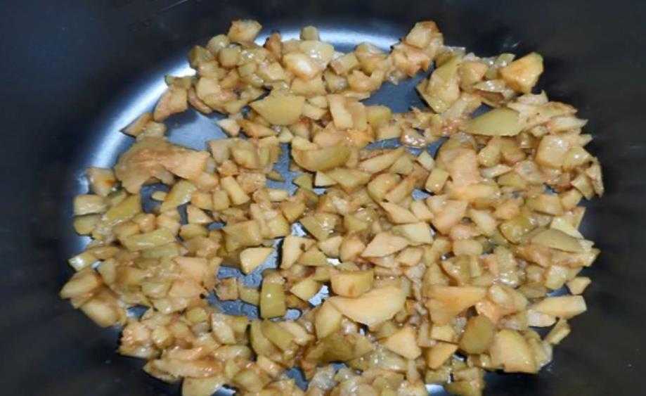 Если есть такая возможность, стоит переложить кусочки яблок в сковородку, где заранее было растоплено сливочное масло, после чего кусочки обжаривают до готовности. Также стоит добавить к этой массе сахарный песок, чтобы яблоки карамелизовались. В отдельной миске перемешивают дробленые орешки и пару ложек панировочных сухарей.