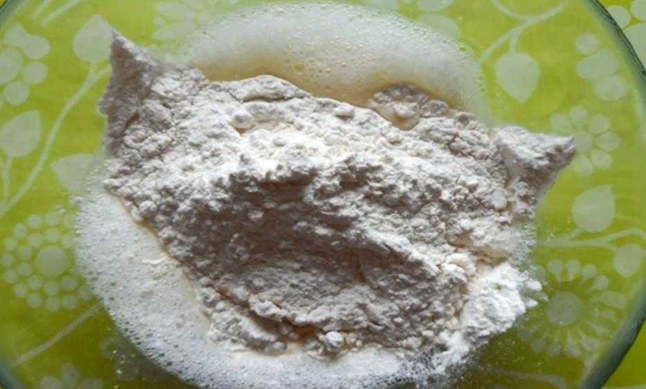 Желток яйца венчиком взбить с оставшейся водой до образования пены. Добавить муку, просеянную через сито, перемешать до однородности.