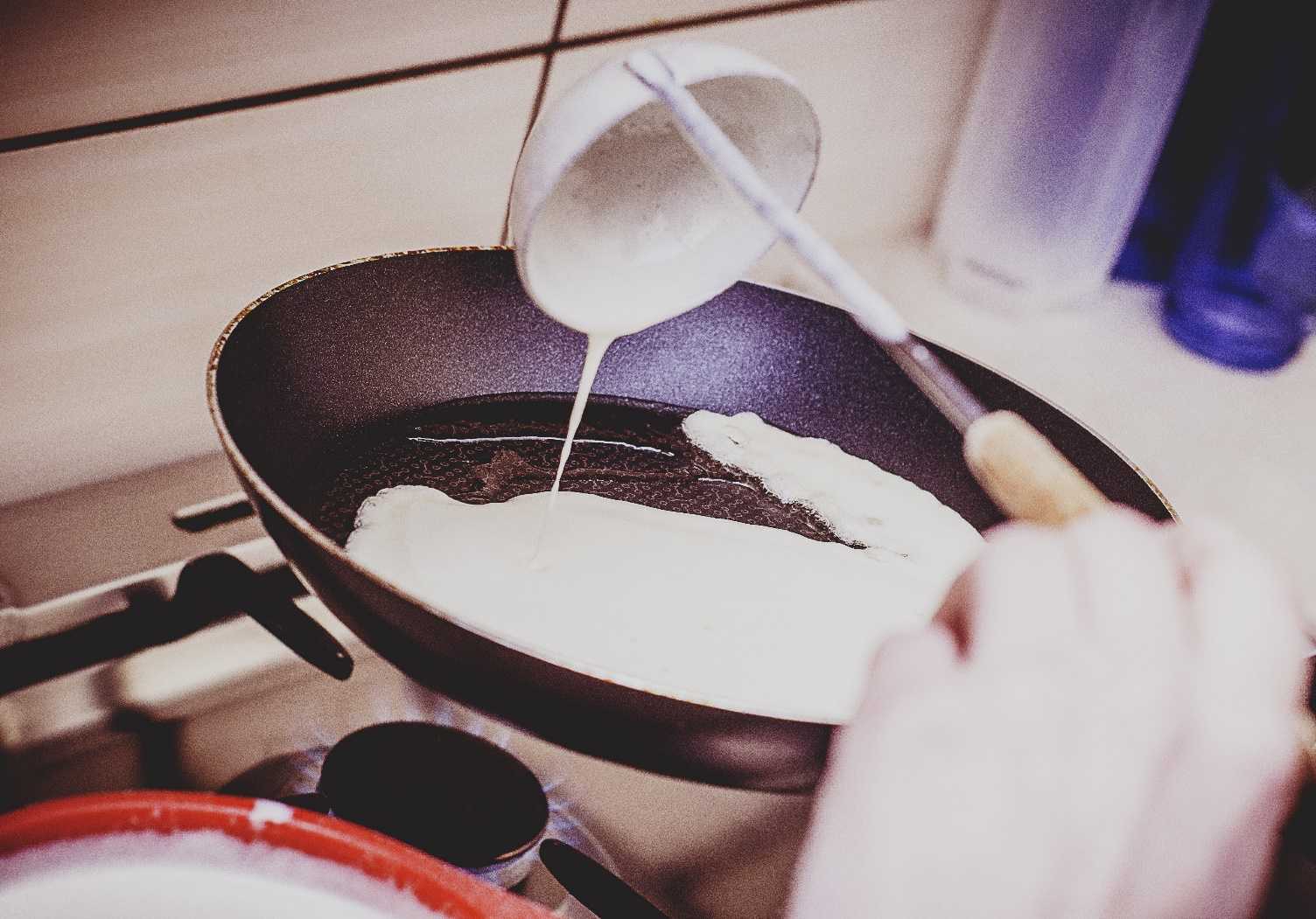 Раскалите Вылейте столько теста для блинов, чтобы оно покрыло дно сковороды тонким равномерным слоем. Когда края блинчика зарумянятся, аккуратно подденьте его лопаточкой и переверните другой стороной.