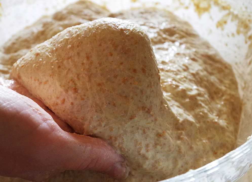 Сначала перемешать полученную смесь при помощи лопаточки или вилки и, как только перемешивать станет достаточно тяжело, убираем вилку-лопаточку в сторону и руками замешиваем эластичное, послушное, не липнущее тесто (время замеса не менее 7-10 минут).