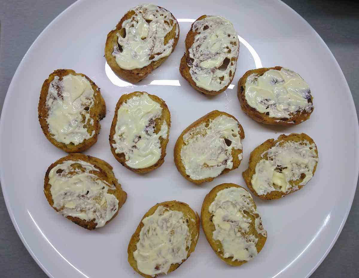 6. Когда поджаренный хлеб немного остынет, его необходимо натереть с двух сторон чесноком, после чего ломтики можно сразу выложить на блюдо для подачи. Затем хлеб надо слегка смазать сверху майонезом – буквально по половине чайной ложечки на кусок для большей сочности и пикантности.
