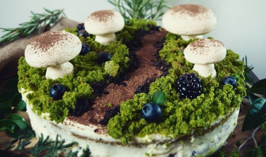 Например, бисквитный мох можно окрасить в зеленый цвет (и использовать для этого можно не только искусственный краситель, но и натуральный, например – сухой сок ячменя) и задекорировать им торт-пенёк или окрасить его в розовый, или красный цвет (посредством порошка красного риса) и сделать кораллы. Можно выбрать желтый оттенок (добиться его можно, используя куркумин, тыквенный порошок или бета-каротин) и сделать морскую губку, чтобы задекорировать торт в морском стиле, а еще можно использовать пудру бамбукового угля и сделать ваш бисквит ядерно-черным! Все зависит только от вашей фантазии и воображения!