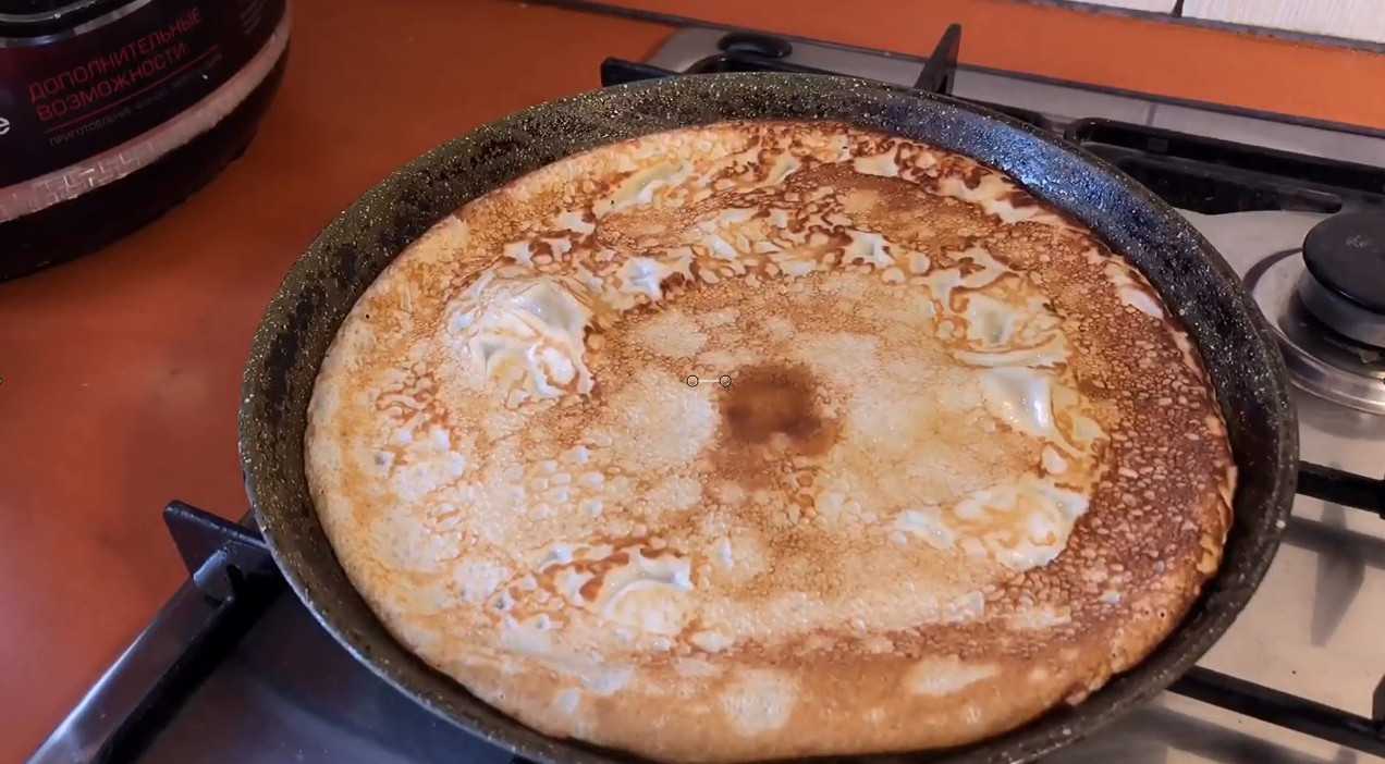 Чем больше нагрета сковорода, тем больше дырочек у блинов. Выпекаем, пока блин не зарумянится с одной стороны, потом переворачиваем.