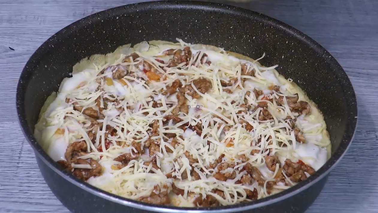 Блинный торт с соусом Бешамель и начинкой из фарша