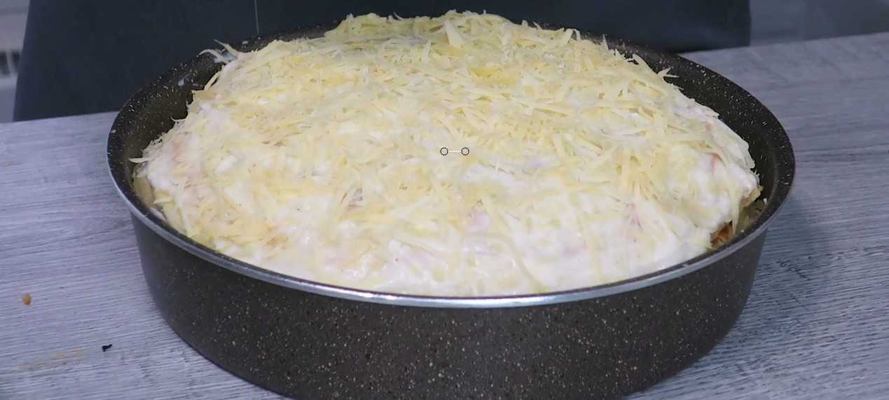 8. Третий уровень нашего торта будет из сырной стружки. Ее насыпаем самостоятельно без каких-либо дополнительных промазываний. Позже при запекании этот слой слегка расплавится и будет сам по себе потрясающим.