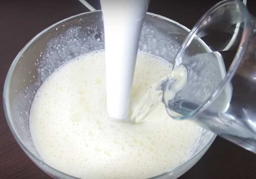 - Добавить к яйцам половину воды, влить горячий кефир, насыпать соду.