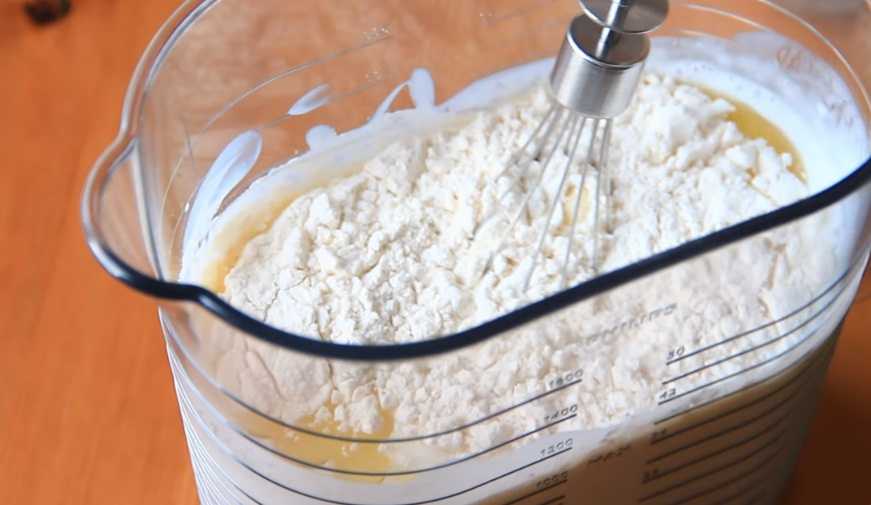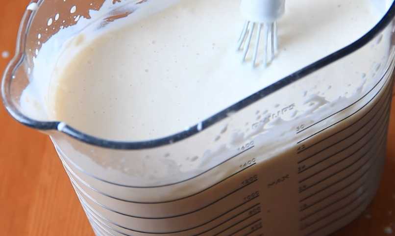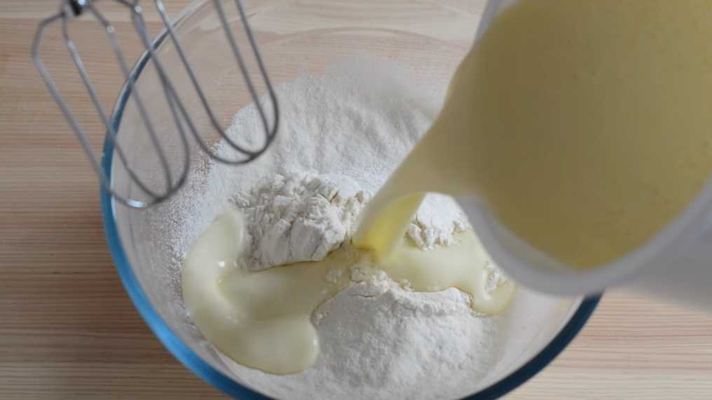Совет: Чтобы было меньше комочков, вливать жидкость в муку нужно постепенно, понемногу, непрерывно взбивая. Тогда тесто получится однородным и гладким.