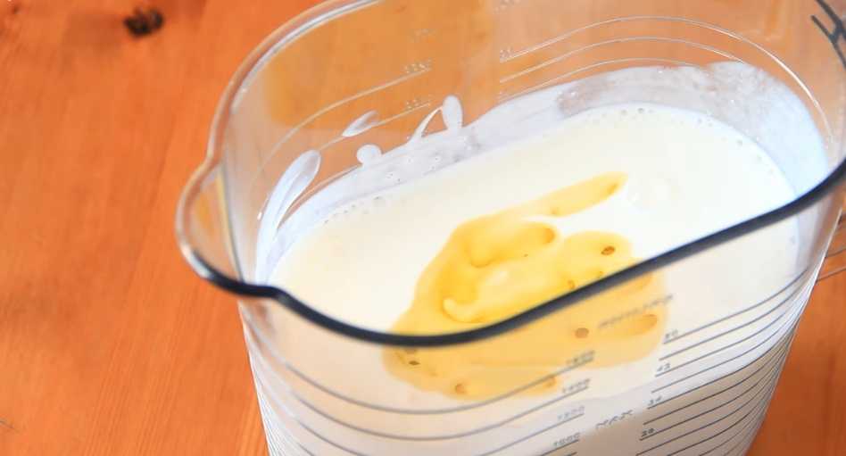 2. Для готовки нам нужен кефир комнатной температуры, или даже слегка теплый. Поэтому лучше достать его из холодильника часа за 1,5 до начала готовки. Если забыли, или не успели, то можете согреть его на водяной бане. Добавить его в яичную смесь, перемешать.