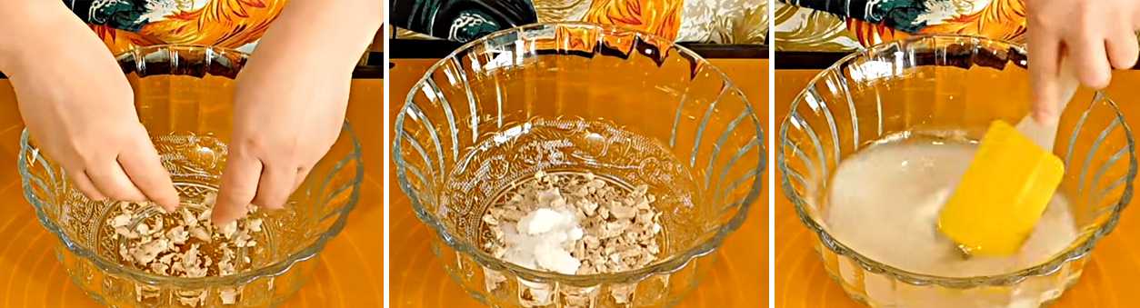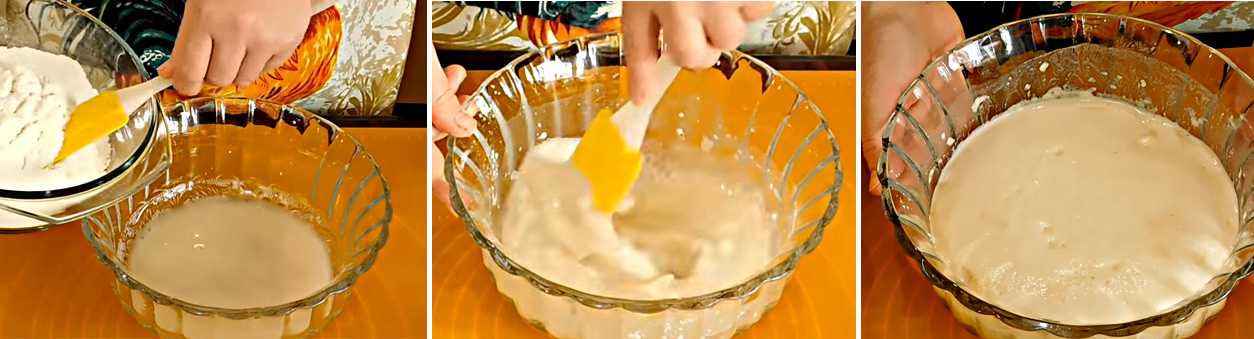 4. Добавляя порциями муку, взбивать получающуюся смесь так, чтобы не оставалось мучных комочков.