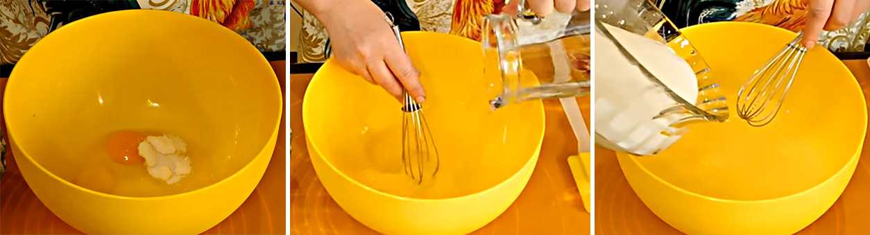 - Разбиваю яйца в большую миску. Венчиком взбиваю их добавляя соль, сахар, молоко и стакан воды.
