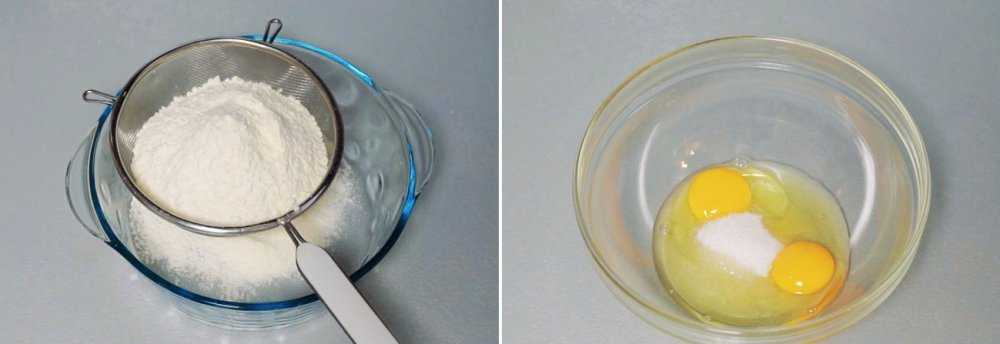 2.Просеивайте частями муку и размешивайте. Проще сначала сделать густое тесто, а потом его разбавлять. Так получится избежать мучных комков. Добавьте сначала стакан муки, размешайте.