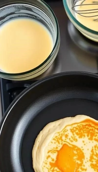 Приготовление теста: В глубокой миске смешайте яйца с сахаром и солью. Добавьте половину молока и тщательно перемешайте. Постепенно всыпайте муку, постоянно помешивая, чтобы не образовались комки. Влейте оставшееся молоко и растительное масло, перемешайте до однородной консистенции. Тесто должно получиться жидким, как нежирные сливки. Дайте тесту постоять 15-20 минут, чтобы мука набухла. Это позволит блинам быть более эластичными и не рваться при выпекании. Помните, что идеальные рисовые блины тоже прекрасный вариант!