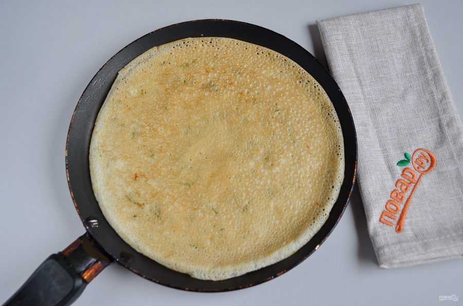Жарьте блины на среднем огне, по 30 секунд с каждой стороны. Признаки того, что блинчик нужно переворачивать – появление пузырьков на тесте или румяные края. Переворачивайте блины тонкой деревянной или силиконовой лопаткой, чтобы не повредить структуру теста. К слову, блинчики должны хорошо отделяться от сковороды и не прилипать.