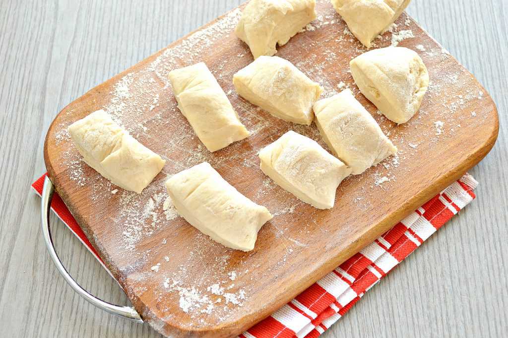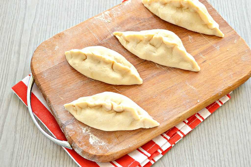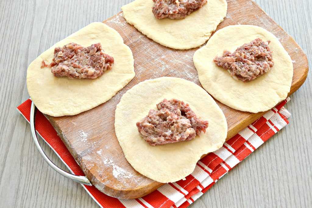 9. Осталось только кусочки размять руками, сформировав из них кружочки, и выложить в центр начинку. Слепив пирожок, положите его на стол, присыпанный мукой. К тому времени, как вы начнете их жарить, тесто успеет подойти.