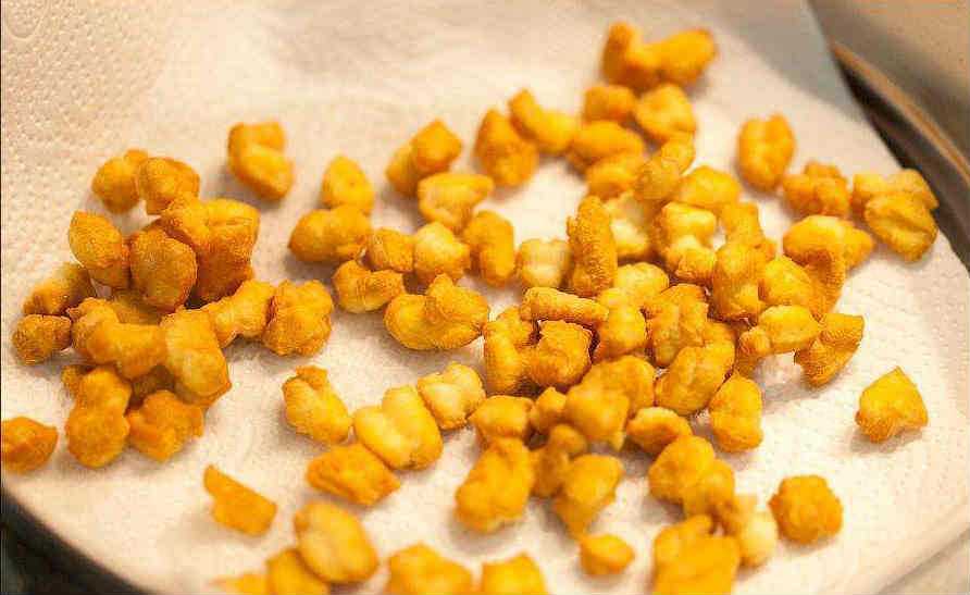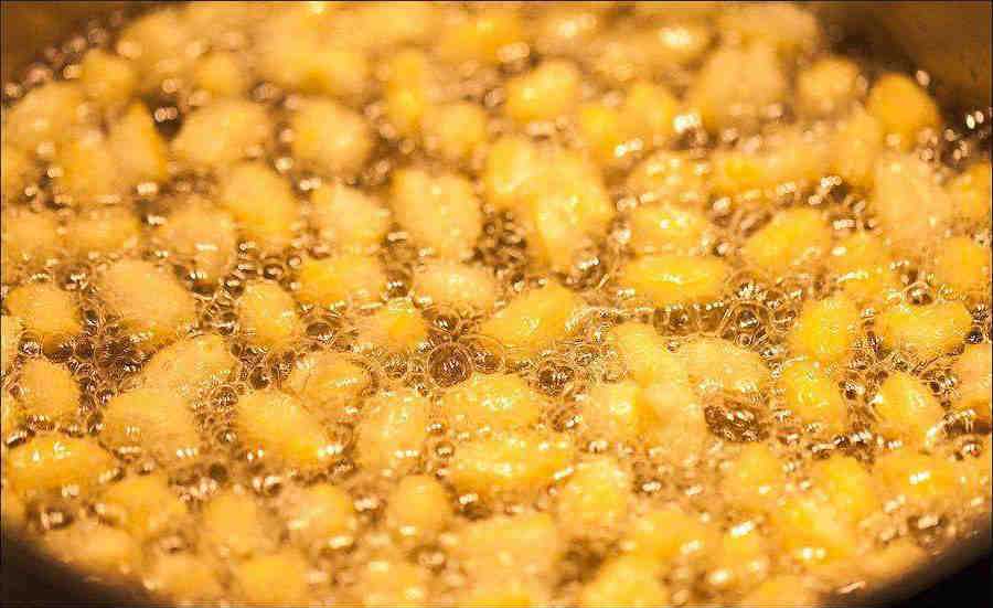 7. Как только вы увидите, что комки стали желтеть сразу же их вынимайте при помощи шумовки. После закиньте следующую порцию, итак до тех пор, пока все не пережарите.