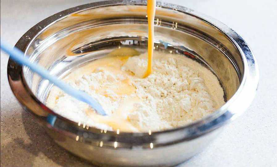 - Во взбитые яйца добавьте просеянную муку в несколько этапов и замесите тесто.