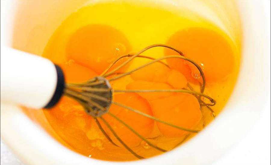 Яйца соединить с сахаром (30 г). Сахар придает тесту при жарке теплый золотистый цвет.