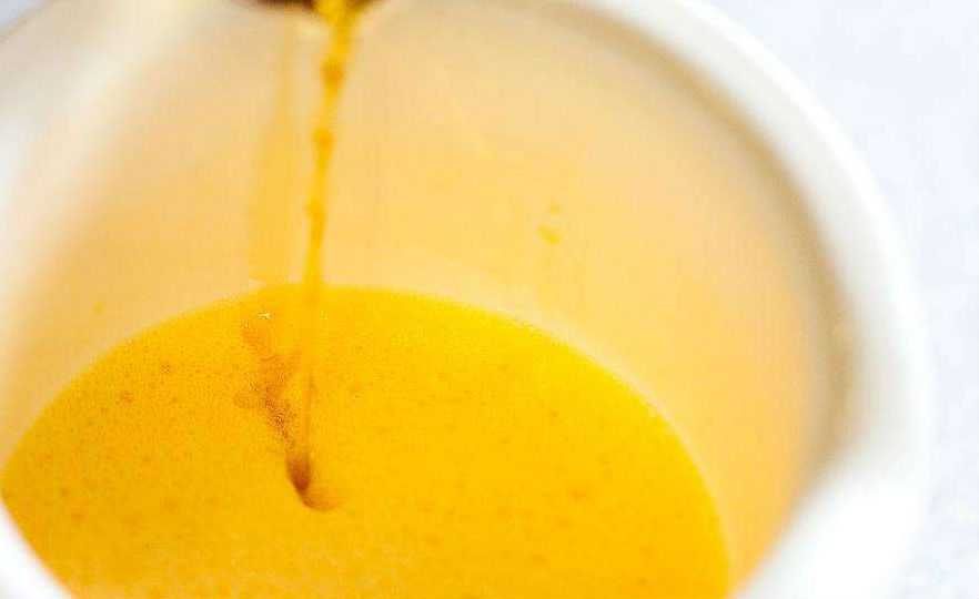 Теплое (не горячее) растопленное масло добавить к яйцам. Перемешать.