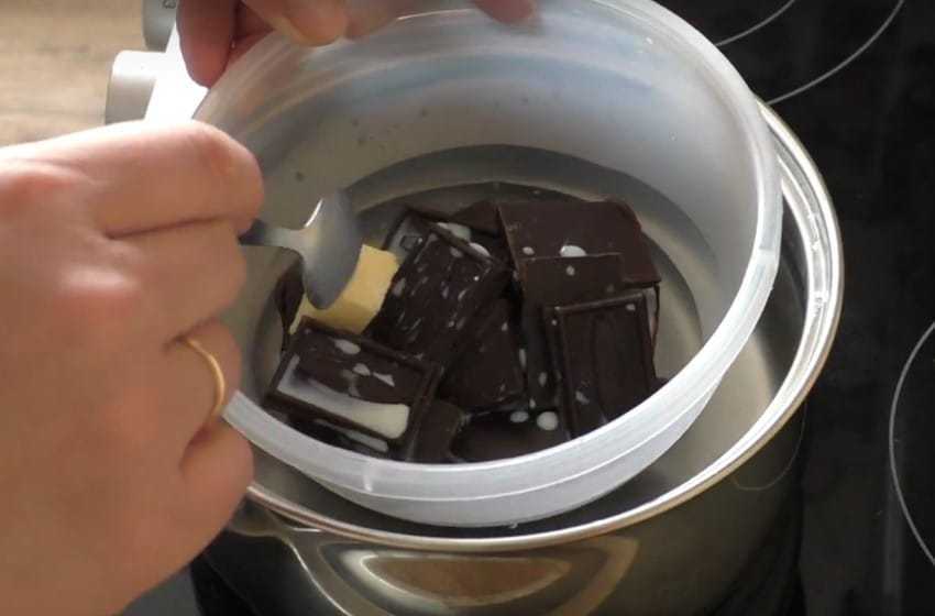 7. Для приготовления глазури соедините шоколад с молоком и маслом, растопите на водяной бане. Если глазурь получилась слишком густой, добавьте еще молока, перемешайте и доведите до нужной консистенции.
