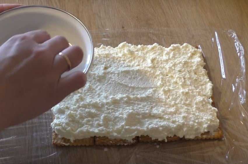 Берем печенье (лучше, чтобы оно было рассыпчатое и нежное) и раскладываем его на расстеленной пищевой пленке. Кладем по пять штук в три ряда. Поверх печенья выкладываем половину творожной массы.