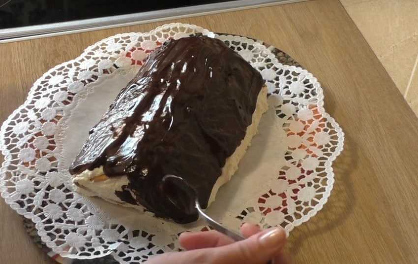 - Края пищевой пленки отгибаем обратно. Щедро смазываем торт шоколадом, так, чтобы все печенье было покрыто им.