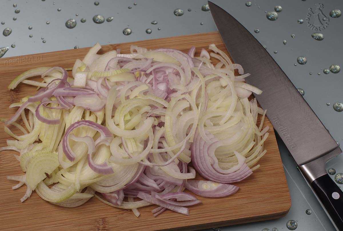 - Из консервных банок слейте жидкость, кусочки рыбы поделите на мелкие фракции. Распределите по капусте. Сверху разложите луковые полукольца.