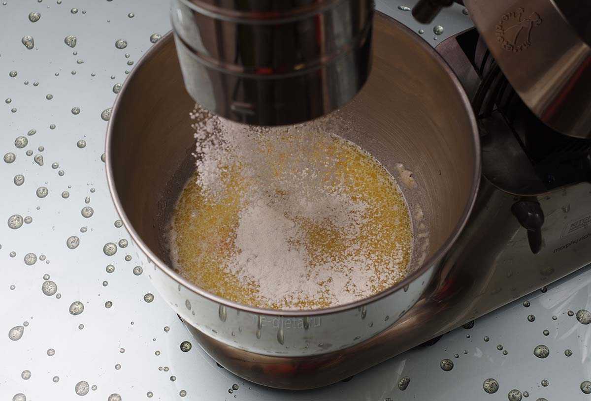 Чайную ложку соды погасить в уксусе и добавить в тесто. Далее просеиваем муку.