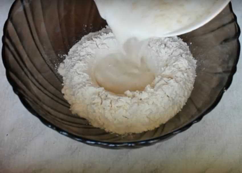 В посуду для замеса с высоким бортом вливаем пол литра нехолодного кефира.