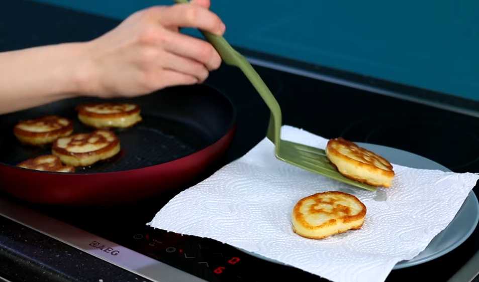 Готовые оладьи выложите на бумажное полотенце или салфетку, так уйдет лишнее масло.