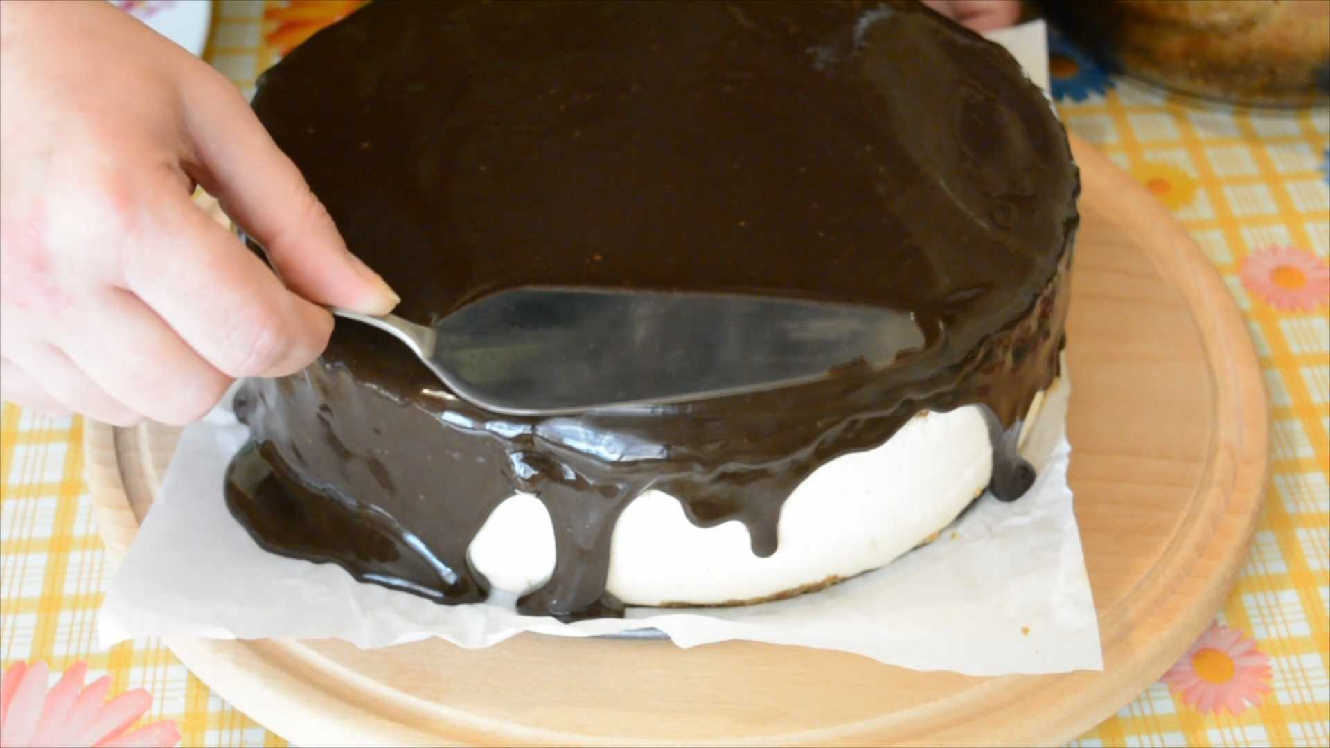 - Аккуратно вылить на поверхность кондитерского изделия (предварительно торт нужно выровнять кремом сверху и с боков).