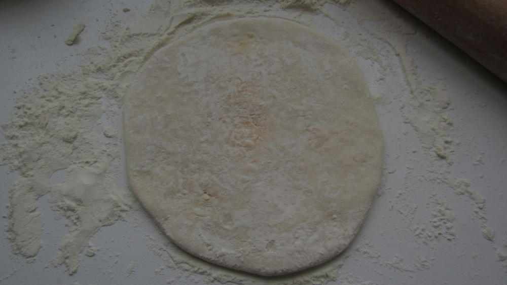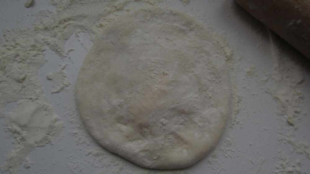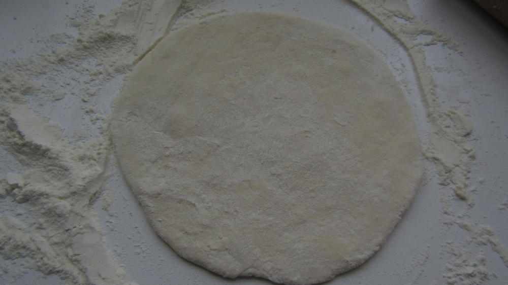 Собранную лепешку снова раскатываем скалкой – получится круг размером около 25 сантиметров и толщиной примерно полтора сантиметра.