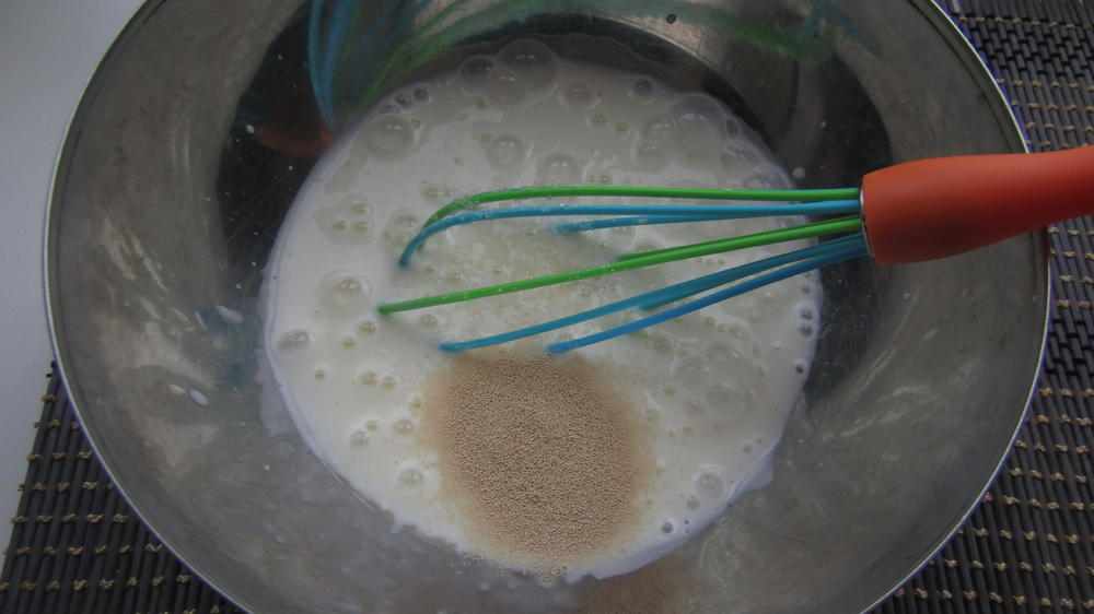 2. В теплой воде хорошо развести дрожжевые сухие гранулы, добавив к ним соль и сахар. Через несколько минут влить эту жидкость в маслянистую мучную смесь. Снова хорошо соединить ингредиенты в чашке.
