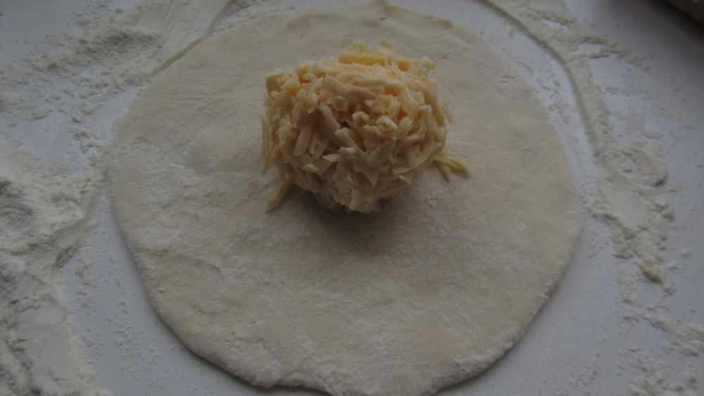 - Вкладываем сырный шарик в центр лепешки и тщательно залепляем края.