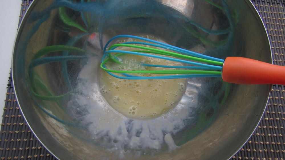 1. В миску разбить яйцо. Перемешать его как следует, можно взбить. Разделить на 2 части: одну оставить в миске для теста, другую — отложить для начинки.