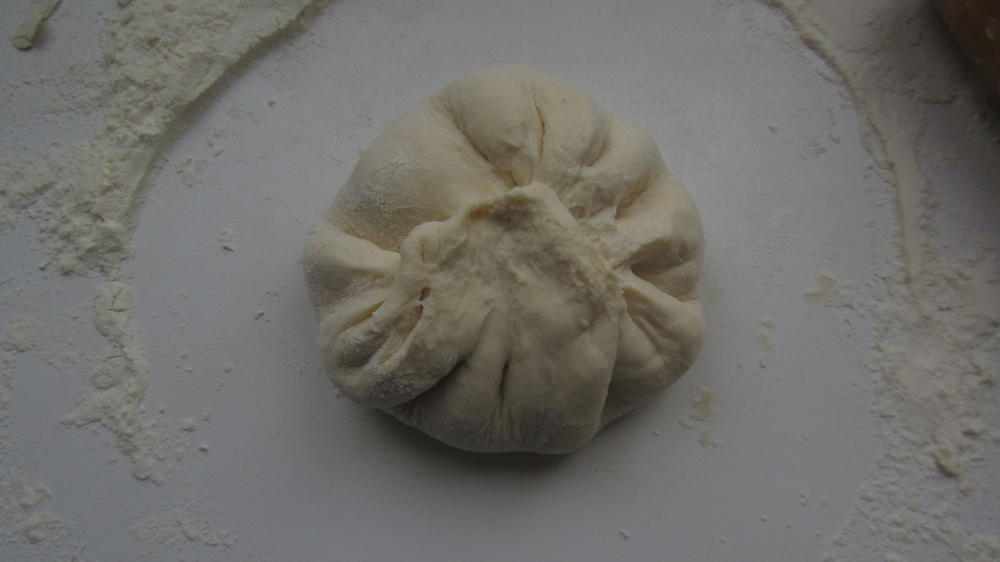 Готовое тесто взвешиваем и делим на три частиРаскатываем каждую лепешку на доскеВыкладываем начинку в центр раскатанной лепешки