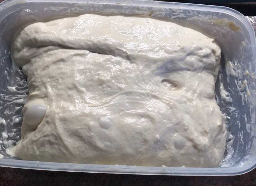 Сначала расскажу про ёмкость, в которой замешиваю тесто. Удобнее всего готовить в прямоугольном контейнере, который можно герметично закрыть крышкой. Я замешивала в прямоугольном, пластиковом контейнере с крышкой.