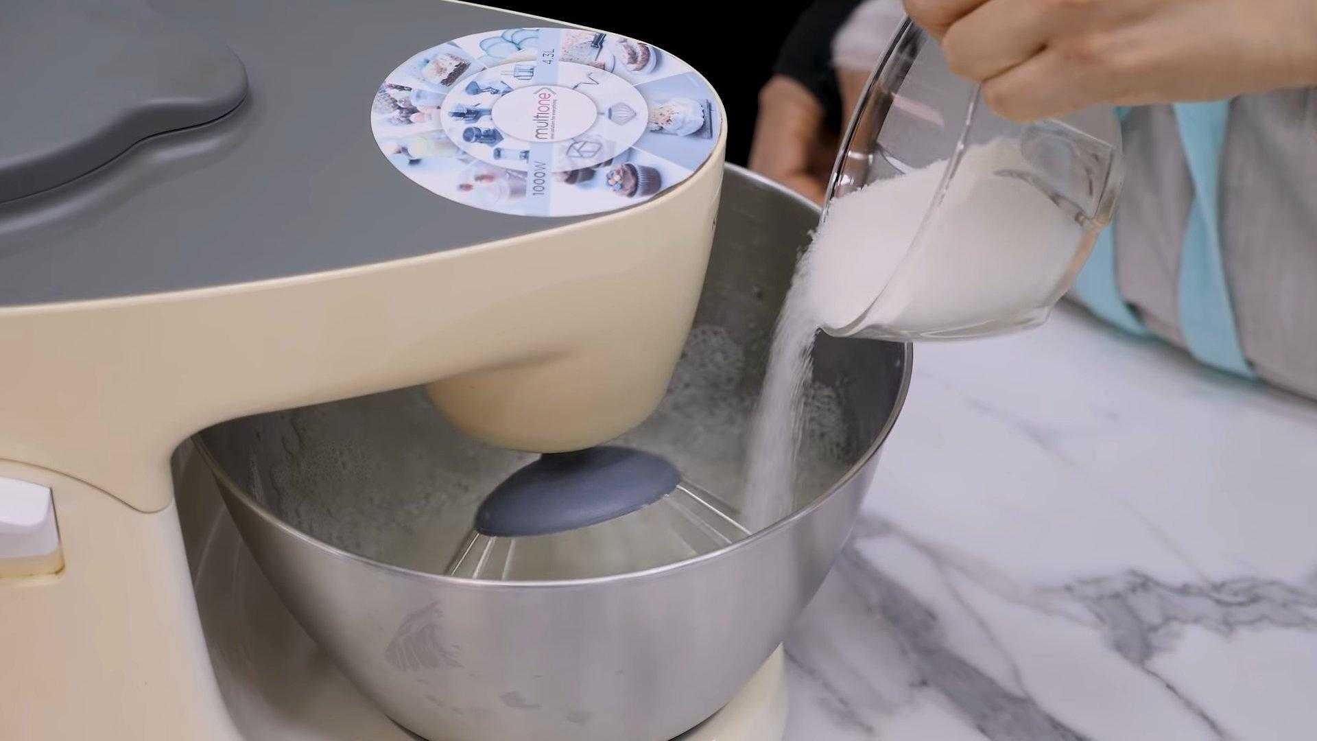Постепенно увеличиваем скорость взбивания и всыпаем к белкам сахар.