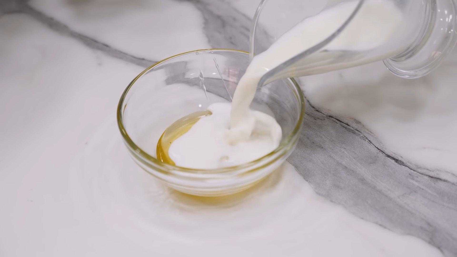 В отдельную ёмкость налейте растительное масло, добавьте молоко. Хорошенько разболтайте смесь.