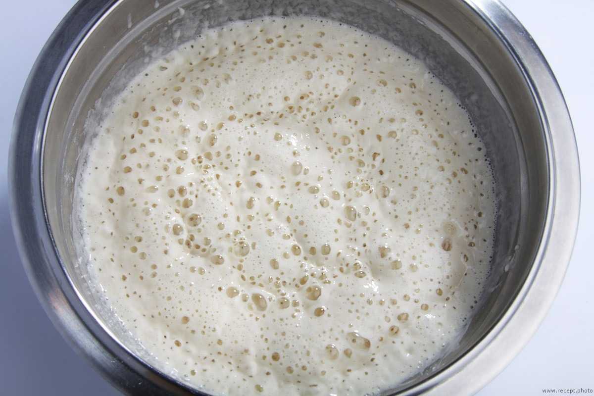 Опара отправляется в теплое место на 30-40 минут, в зависимости от температуры в помещении. Готовая опара насыщена пузырьками и увеличивается в объеме.
