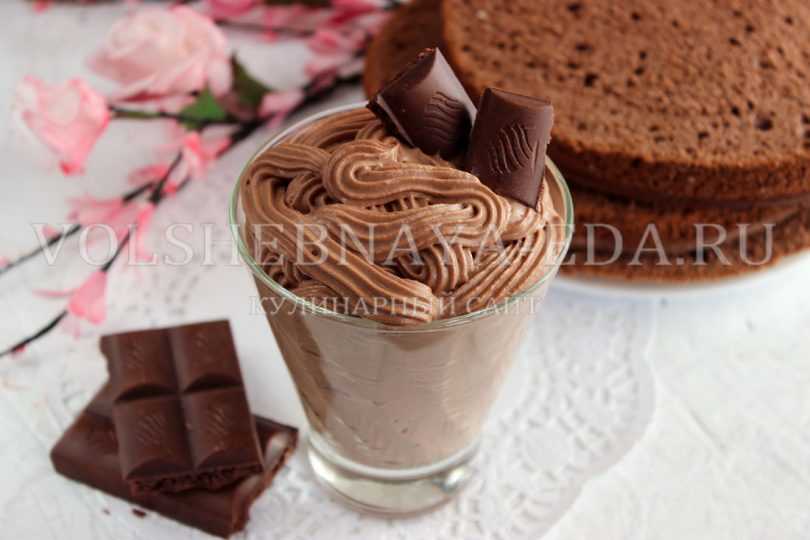 Яйца, молоко, сахар, крахмал уварить до плотной консистенции («как жирная сметана»), добавить мелко нарубленный шоколад и растворить в горячей заварной массе. Сливки охладить и взбить до глянцевых плотных пик. Остуженную смесь взбить вместе с размягченным сливочным маслом, в конце вмешать лопаткой взбитые сливки.
