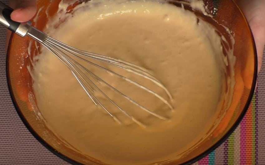 3. Муку просейте, добавьте ее в жидкую массу и хорошо размешайте. По консистенции будет похоже на густую сметану.