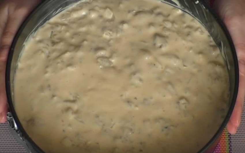 Три яйца, 1/2 — 1 стакан молока или сливок смешиваем, солим, перчим, добавляем зелень и натертый сыр. Тут не требуется какого-то взбивания, просто хорошо перемешиваем.