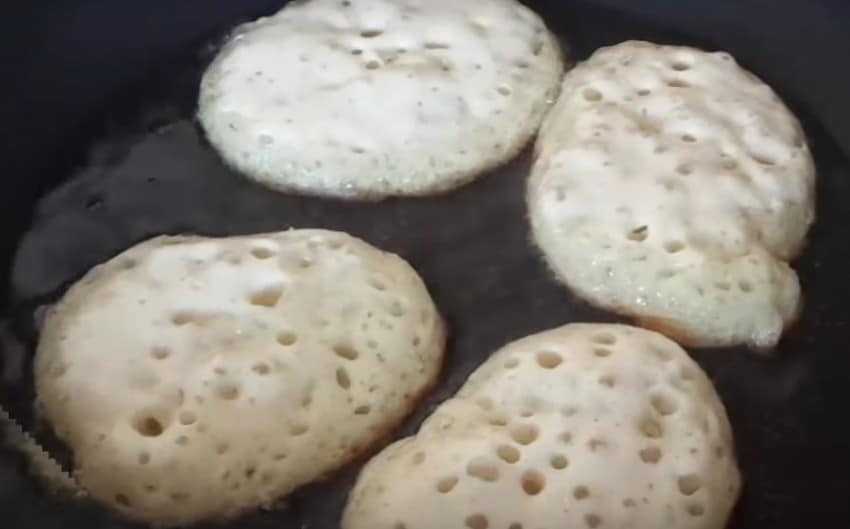 Буквально сразу вы увидите, что тесто начинает расти, и оладьи увеличиваются в объеме. Переверните их на другую сторону, как только у них поджарится низ. Пожарьте их и с этой стороны до золотистого цвета. Оладьи жарим на небольшом огне, потому что даже при наличии золотистой корочки они могут оставаться сырыми внутри.