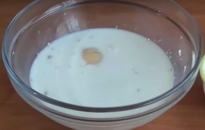 1. В миску вылейте теплое молоко, добавьте сахар и дрожжи. Перемешайте и оставьте на 5 минут.