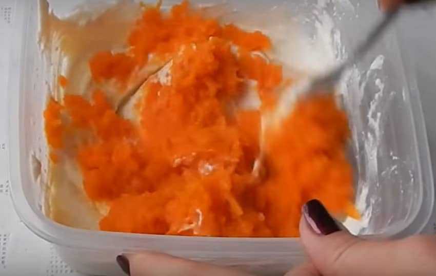 3. Вернитесь к готовой тыкве. Разомните ее до состояния пюре и добавьте к тесту. Уберите все ненадолго в холодильник.