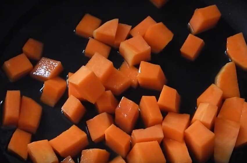 1. Тыкву очистите от кожуры и нарежьте мелкими кубиками. Выложите на сковороду, залейте небольшим количеством воды. Тушите до мягкости 10-15 минут.