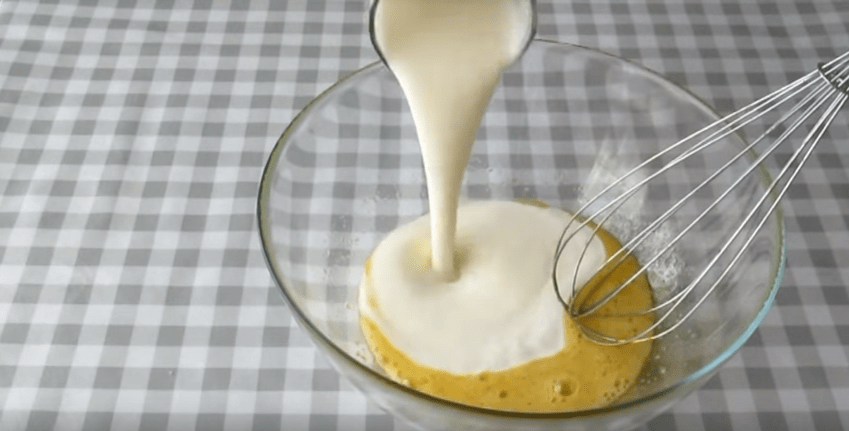 - Кефир подогреваем в микроволновке или на медленном огне до теплого состояния (не кипятим). Постепенно вливаем кисломолочный продукт к сахарно-яичной смеси, продолжая смешивать компоненты венчиком.