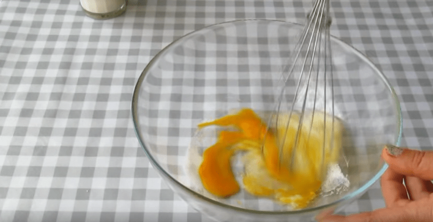 - Яйцо взбиваем с сахаром и солью. Энергично работаем венчиком, объединяя белок и желток.