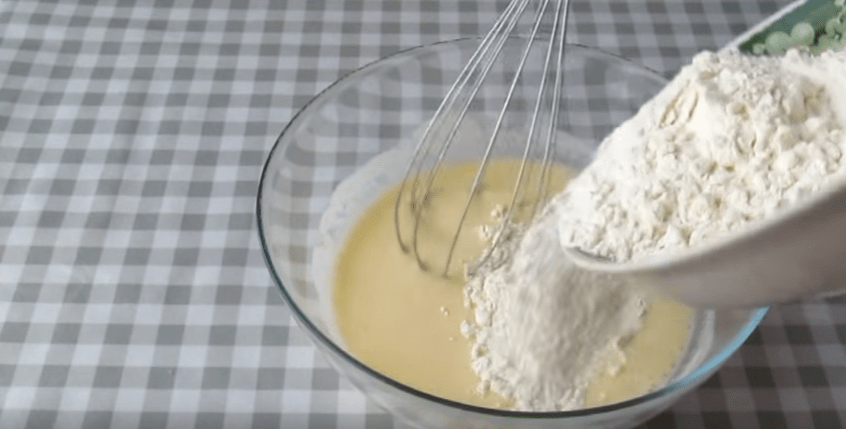 Затем добавить просеянную муку и соду. Обычно соду бросают в кефир, чтобы она погасилась, здесь же нужно добавлять именно с мукой.