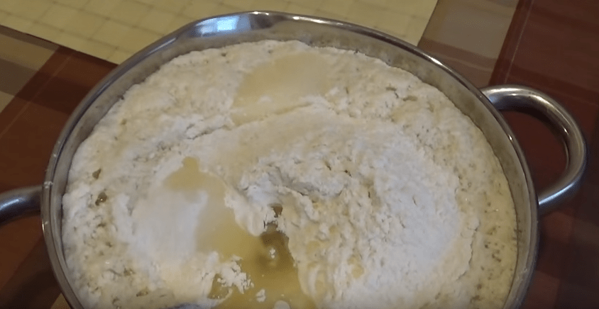 Далее переливаем содержимое стакана в миску с мукой и добавляем 2 ч. ложки оливкового масла (можно растительного).